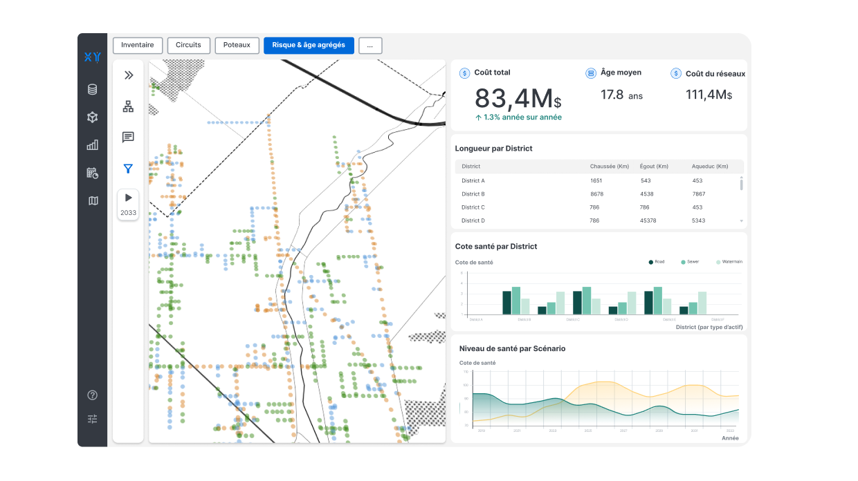 En intégrant la dégradation, les bénéfices et les interventions de vos actifs à chaque étape de leur cycle de vie, vous obtenez un modèle qui simule clairement les futurs possibles selon chaque stratégie d’investissement.
