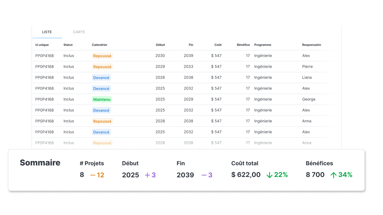 Priorisez vos portefeuilles d’investissements pour maximiser la valeur générée, tout en équilibrant budgets, risques et échéanciers pour les projets qui soutiennent votre stratégie de gestion d’actifs à long terme.